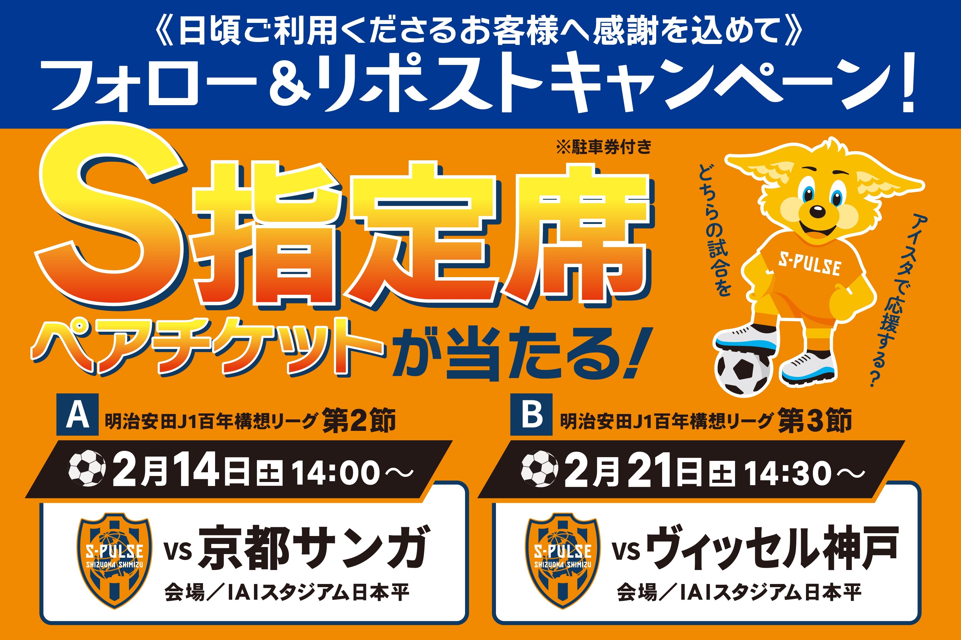 【清水エスパルス】S指定席観戦ペアチケットが当たる!キャンペーン実施中